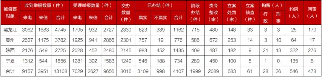 有关省(区)高度重视督察工作,将督察作为坚决贯彻习近平生态文明思想的重要内容,作为推动高质量发展的重要契机,主要领导通过督察动员、现场督办、召开专题会议等方式,大力推动整改落实。截至目前,各督察组共收到群众来电、来信举报13108件,受理有效举报9656件,经梳理合并重复举报,累计向相关省(区)转办8016件。相关省(区)已办结或阶段办结6106件。其中,立案处罚683家,立案侦查61件,拘留54人;约谈党政领导干部546人,问责党政领导干部478人。
