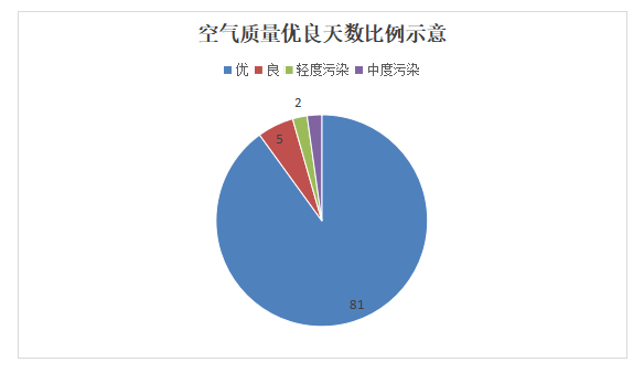 1-3月空气质量优天数:81天、良天数:5天、轻度污染天数2天、中度污染天数2天。空气质量优良天数比例95.6%。
