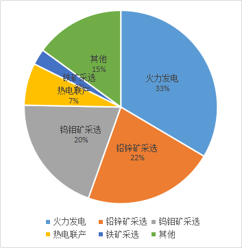 2024年,一般工业固体废物产生量排名前五的行业依次为火力发电、铅锌矿采选、钨钼矿采选、热电联产、铁矿采选,分别占全盟一般工业固体废物产生量的33.5%、21.94%、19.87%、7.06%、2.66%,详细情况见图1。