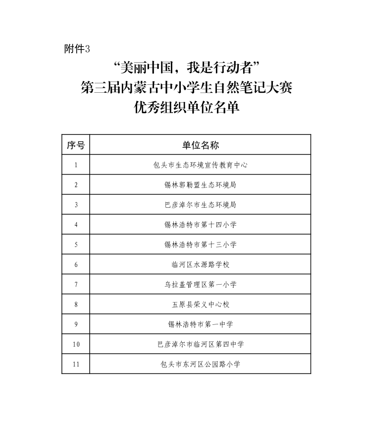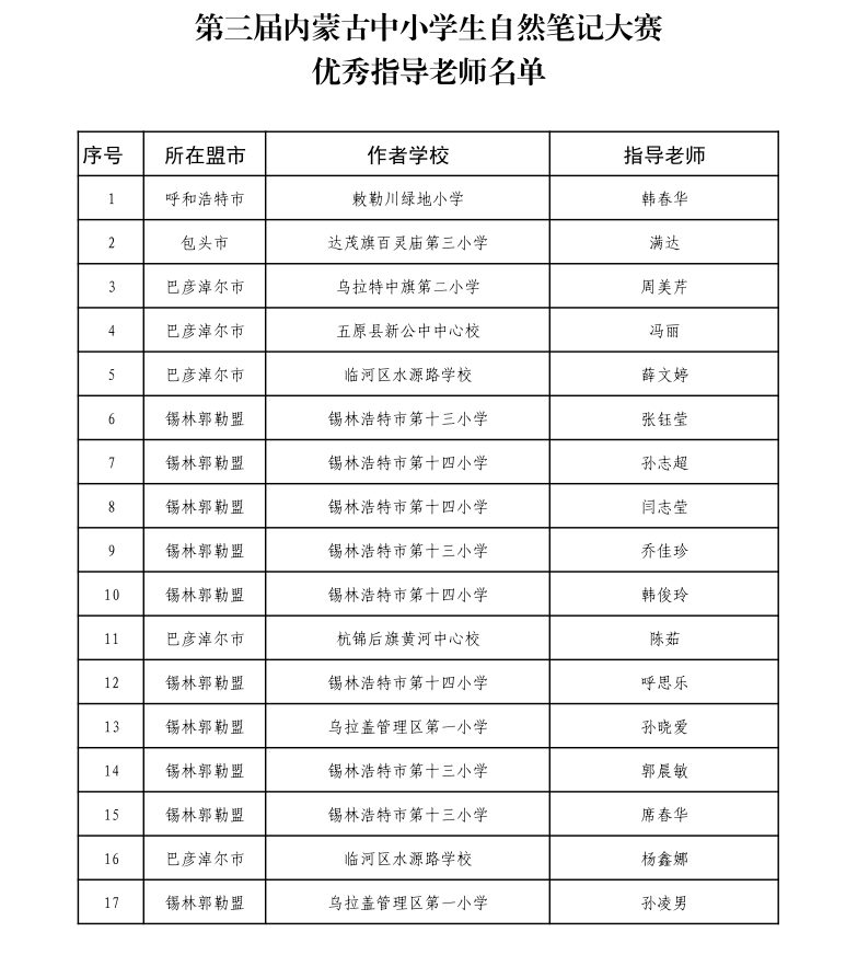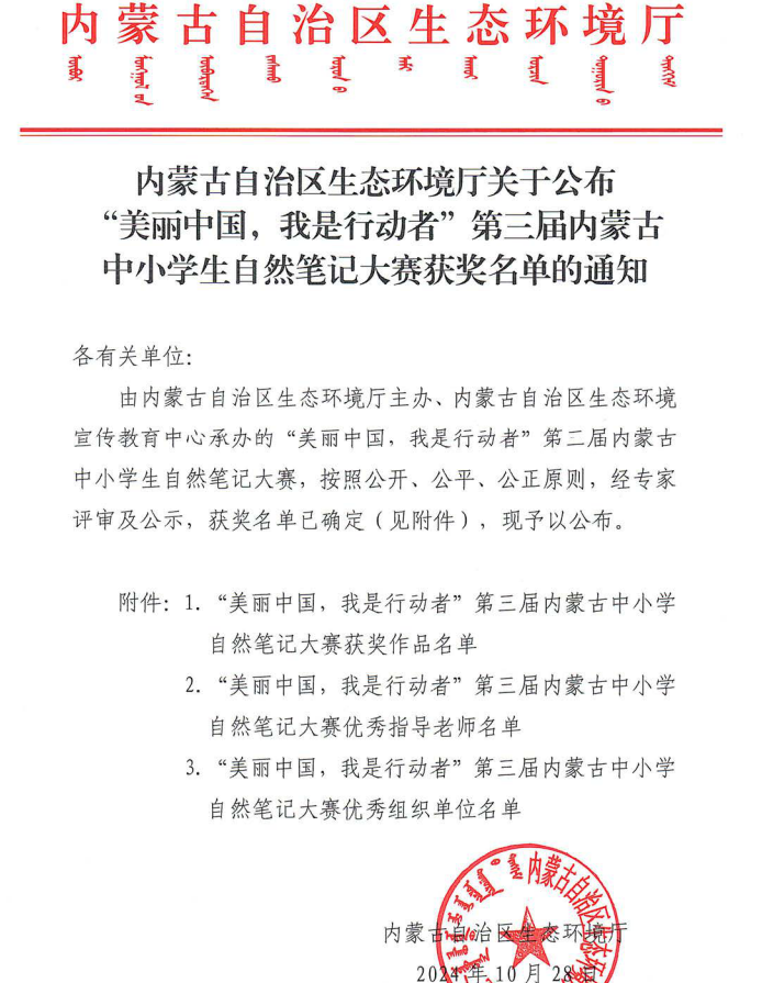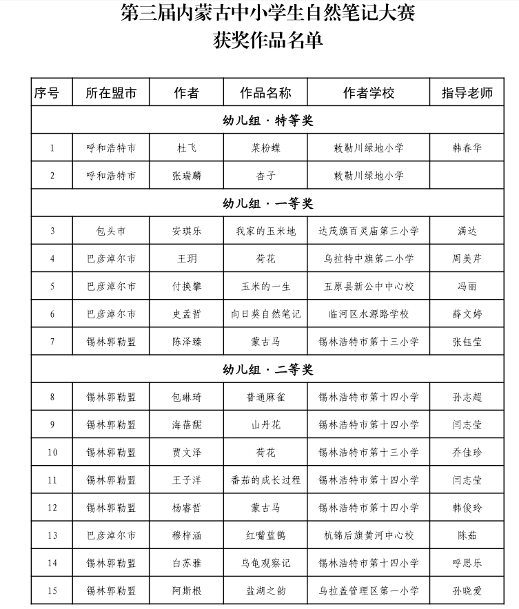 近日,内蒙古自治区生态环境厅公布由内蒙古自治区生态环境厅主办、内蒙古自治区生态环境宣传教育中心承办的“美丽中国,我是行者”第三届内蒙古中小学生自然笔记大赛获奖名单,全球最大赌球网站、锡林浩特市第十四小学、锡林浩特市第十三小学、乌拉盖第一小学、锡林浩特市第一中学获得优秀组织单位;锡林浩特市第十四小学、锡林浩特市第十三小学、乌拉盖第一小学、锡林浩特市第一中学等多所中小学18名指导老师,45名学生斩获各类奖项。