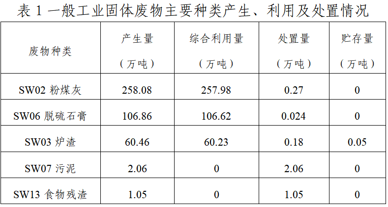 2024年,一般工业固体废物产生量排名前五的种类依次为SW02粉煤灰、SW06脱硫石膏、SW03炉渣、SW07污泥、SW13食物残渣,产生量分别占全市一般工业固体废物产生总量的61%、25%、14%、0.5%、0.2%,详细情况见表1