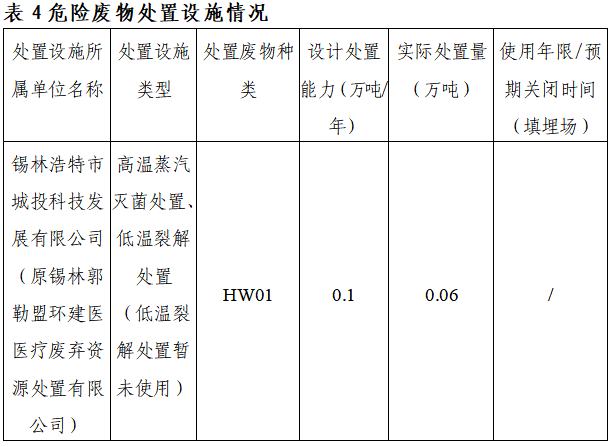 2024年,本市共有1家单位从事危险废物处置活动,本市危险废物处置能力为0.1万吨/年,主要处置设施情况见表4