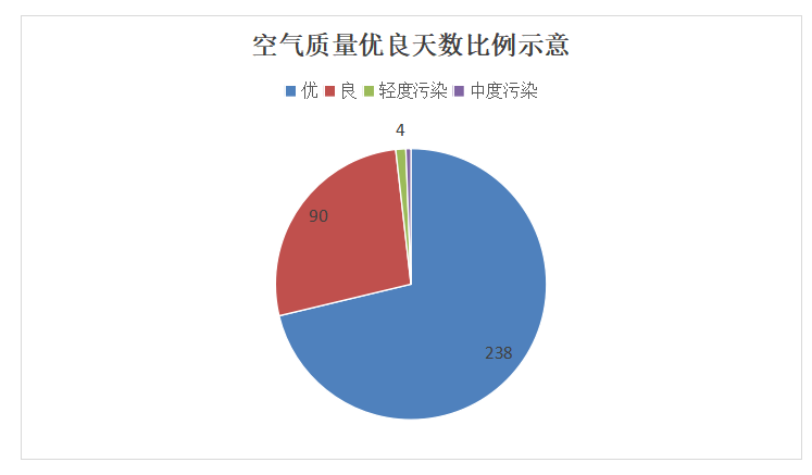 1-11月空气质量优天数:238天、良天数:90天、轻度污染天数4天、中度污染天数2天。空气质量优良天数比例98.2%。