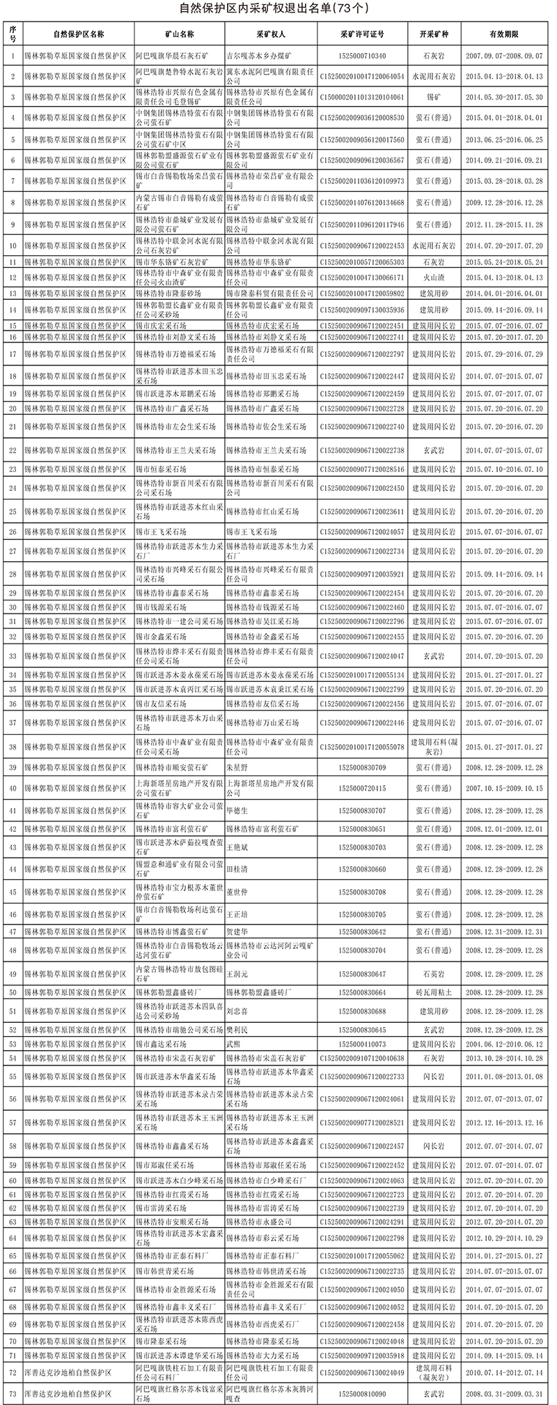 根据《中华人民共和国矿产资源法》、《中华人民共和国自然保护区条例》等法律法规和《内蒙古自治区自然保护区内工矿企业退出方案》(内政发电〔2017〕28号)、《全球最大赌球网站自然保护区内工矿企业退出方案》(锡署发〔2017〕126号)要求,经研究,决定对锡林郭勒草原国家级自然保护区、古日格斯台国家级自然保护区、浑善达克沙地柏自治区级自然保护区、都呼木柄扁桃自治区级自然保护区、贺斯格淖尔湿地自治区级自然保护区、乌拉盖湿地自治区级自然保护区6个自然保护区内的73个采矿权和77个探矿权依法退出,现予以公告。