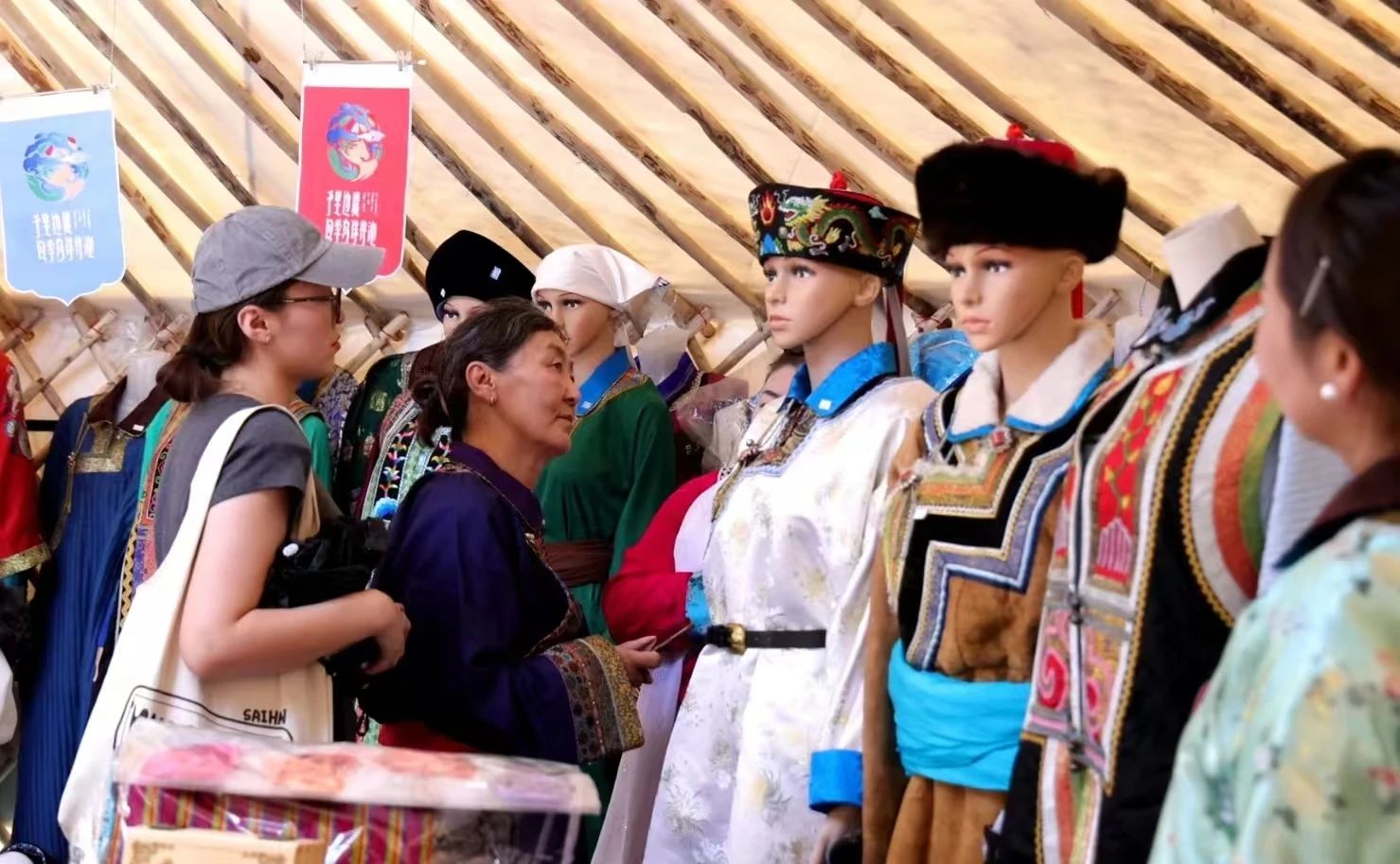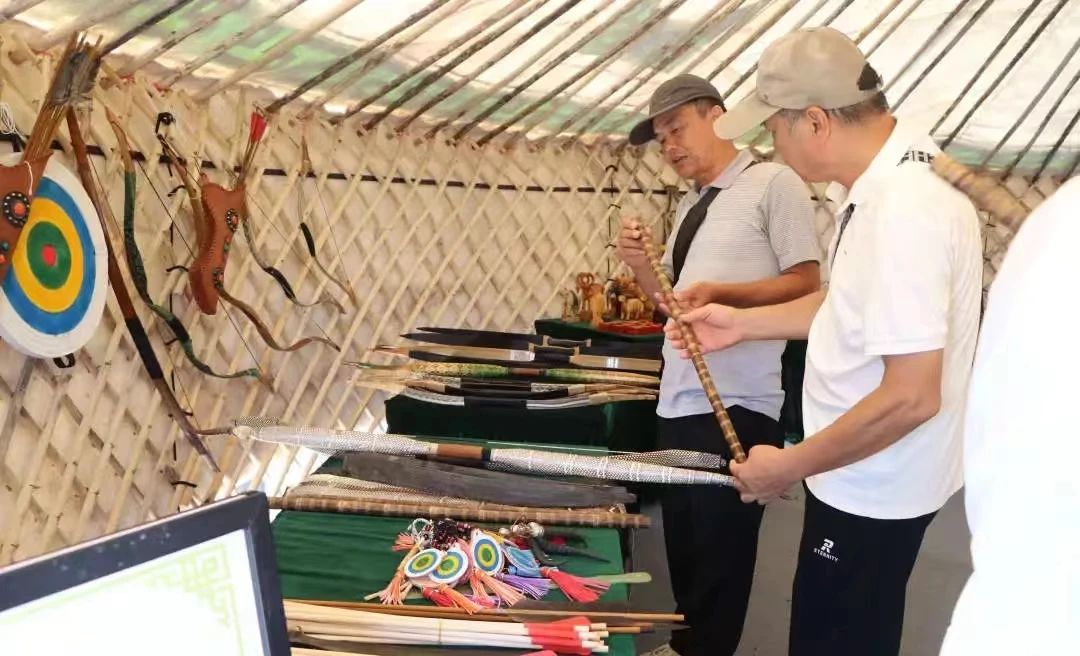 在北疆文化非遗展中,每个挂有“北疆文化 多彩非遗”门牌的蒙古包中,错落有致得摆放着刀工精湛的骨雕、木雕,色彩绚丽的乌珠穆沁传统图案,蒙古族毡绣技艺作品,传统服饰制作技艺缝制的乌珠穆沁蒙古袍,乌珠穆沁传统刺绣,乌珠穆沁马鞍具和蒙古族传统牛角弓等,游客们在观赏的同时,可以更好地感受北疆文化及多彩非遗的魅力,了解东乌旗的风土人情及浓厚的地域文化。