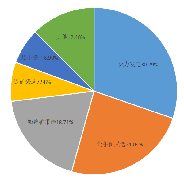 2023年,一般工业固体废物产生量排名前五的行业依次为火力发电、钨钼矿采选、铅锌矿采选、铁矿采选、热电联产,分别占全盟一般工业固体废物产生量的30.29%、24.04%、18.71%、7.58%、6.9%,详细情况见图1。