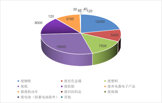 2023年,全盟再生资源回收总量为5.47万吨,其中废钢铁、废有色金属、废塑料、废纸、废轮胎、废弃电器电子产品、报废机动车、废旧纺织品、废玻璃、废电池(铅蓄电池除外)等十大类别的再生资源回收总量为5.45万吨,占再生资源回收总量的99.8%。2023年再生资源主要十大类别回收情况见图3。