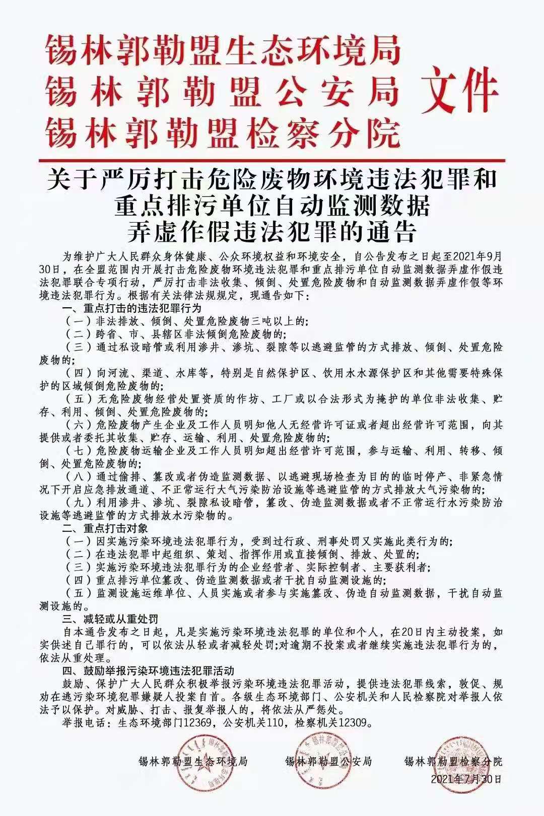 关于严厉打击危险废物环境违法犯罪和重点排污单位自动监测数据弄虚作假违法犯罪的通告