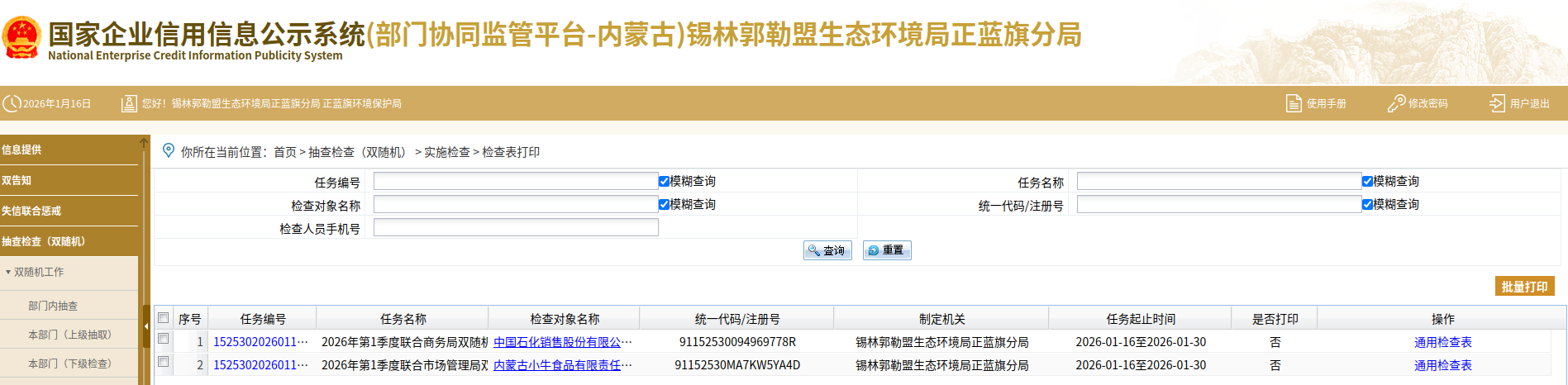 按照生态环境“双随机、一公开”工作计划,全球最大赌球网站正蓝旗分局于2026年1月16日开展了双随机抽查工作,共抽取企业2家,执法人员3人。现将抽取结果予以公开。