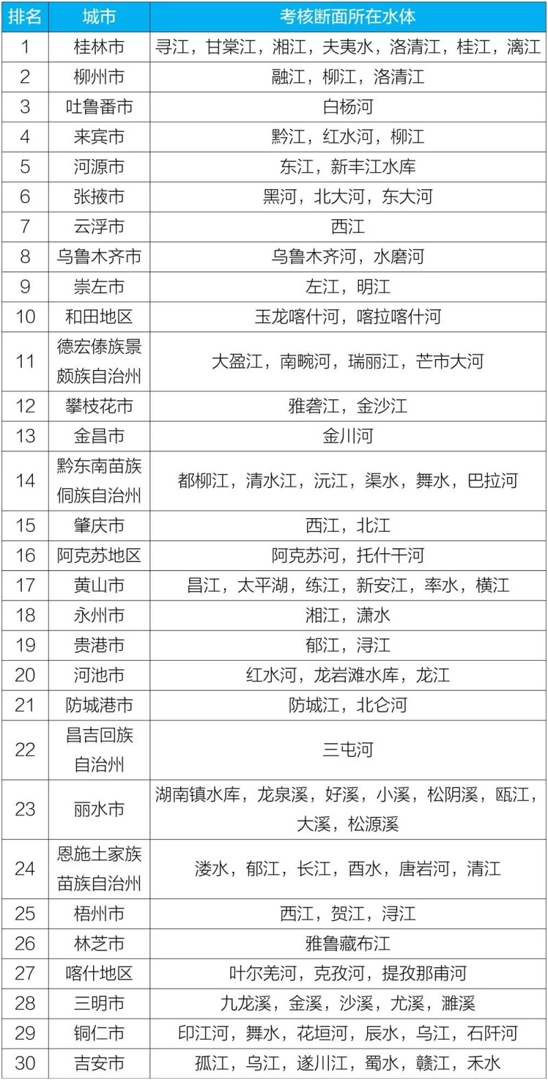 2020年10月国家地表水考核断面水赌球网站状况排名前30位城市及所在水体
