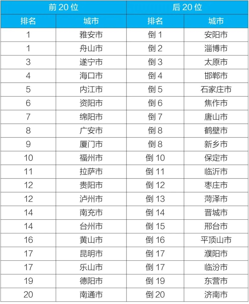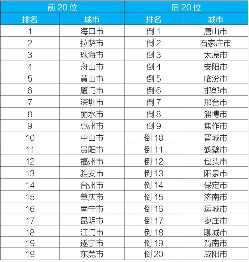 2020年10月168个重点城市排名前20位和后20位城市名单
