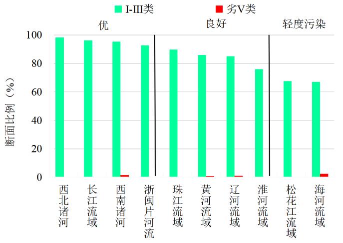 2020年1-10月,长江、黄河、珠江、松花江、淮河、海河、辽河等七大流域及西北诸河、西南诸河和浙闽片河流Ⅰ-Ⅲ类水质断面比例为85.6%,同比上升6.2个百分点;劣Ⅴ类为0.4%,同比下降2.6个百分点。主要污染指标为化学需氧量、高锰酸盐指数和总磷。其中,西北诸河、长江流域、西南诸河、浙闽片河流和珠江流域水质为优,黄河和松花江流域水质良好,淮河、辽河和海河流域为轻度污染。
