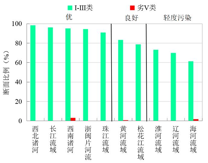 2020年10月,长江、黄河、珠江、松花江、淮河、海河、辽河等七大流域及西北诸河、西南诸河和浙闽片河流Ⅰ-Ⅲ类水质断面比例为86.7%,同比上升6.4个百分点;劣Ⅴ类为0.4%,同比下降1.7个百分点。主要污染指标为化学需氧量、高锰酸盐指数和总磷。其中,西北诸河、长江流域、西南诸河和浙闽片河流水质为优,珠江、黄河、辽河和淮河流域水质良好,松花江和海河流域为轻度污染。