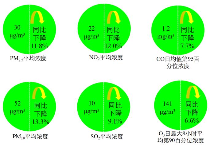 1-10月,全国337个地级及以上城市平均优良天数比例为87.7%,同比上升5.5个百分点;PM2.5浓度为30微克/立方米,同比下降11.8%;PM10浓度为52微克/立方米,同比下降13.3%;O3浓度为141微克/立方米,同比下降6.6%;SO2浓度为10微克/立方米,同比下降9.1%;NO2浓度为22微克/立方米,同比下降12.0%;CO浓度为1.2毫克/立方米,同比下降7.7%。