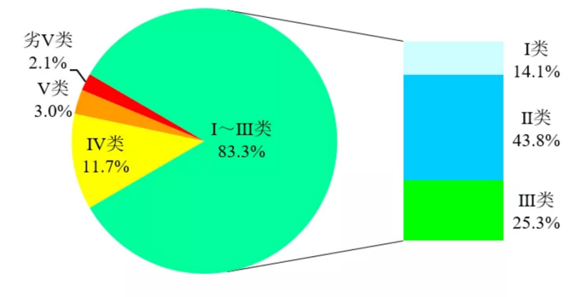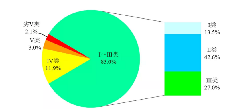 1-3月,3641个国家地表水考核断面中,水质优良(Ⅰ~Ⅲ类)断面比例为83.0%,同比上升2.7个百分点;劣Ⅴ类断面比例为2.1%,同比下降1.4个百分点。主要污染指标为化学需氧量、高锰酸盐指数和总磷。