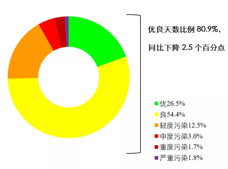 1-3月,全国339个地级及以上城市平均优良天数比例为80.9%,同比下降2.5个百分点;PM2.5平均浓度为45微克/立方米,同比下降2.2%;PM10平均浓度为75微克/立方米,同比上升13.6%;O3平均浓度为108微克/立方米,同比上升2.9%;SO2平均浓度为12微克/立方米,同比上升9.1%;NO2平均浓度为29 微克/立方米,同比上升20.8%;CO平均浓度为1.3毫克/立方米,同比下降13.3%。