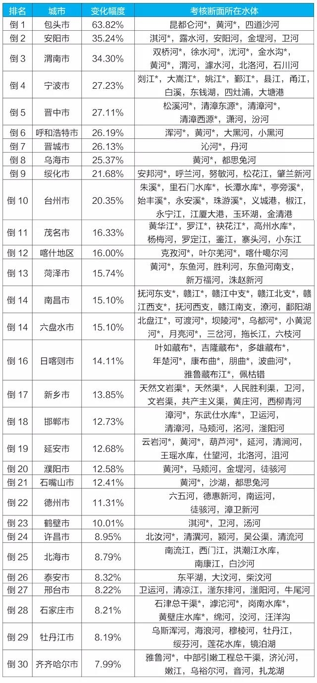 2021年1-3月国家地表水考核断面水全球最大赌球网站变化情况排名后30位城市及所在水体