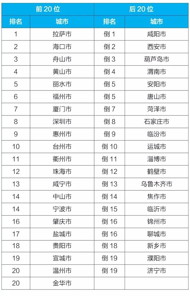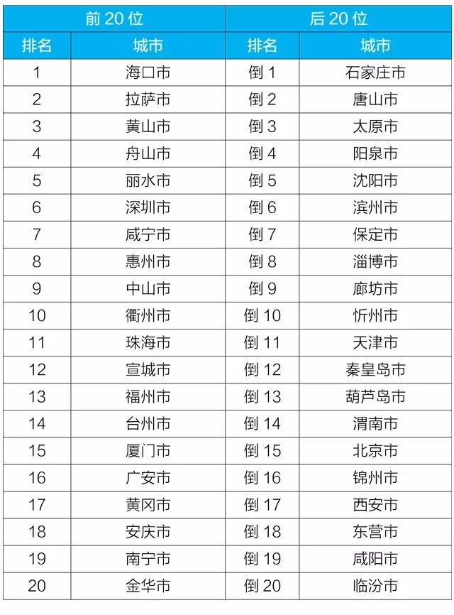 3月,168个重点城市中,石家庄、唐山和太原市等城市空气质量相对较差(从倒数第1名至倒数第20名);海口、拉萨和黄山市等城市空气质量相对较好(从第1名至第20名),见附表5。