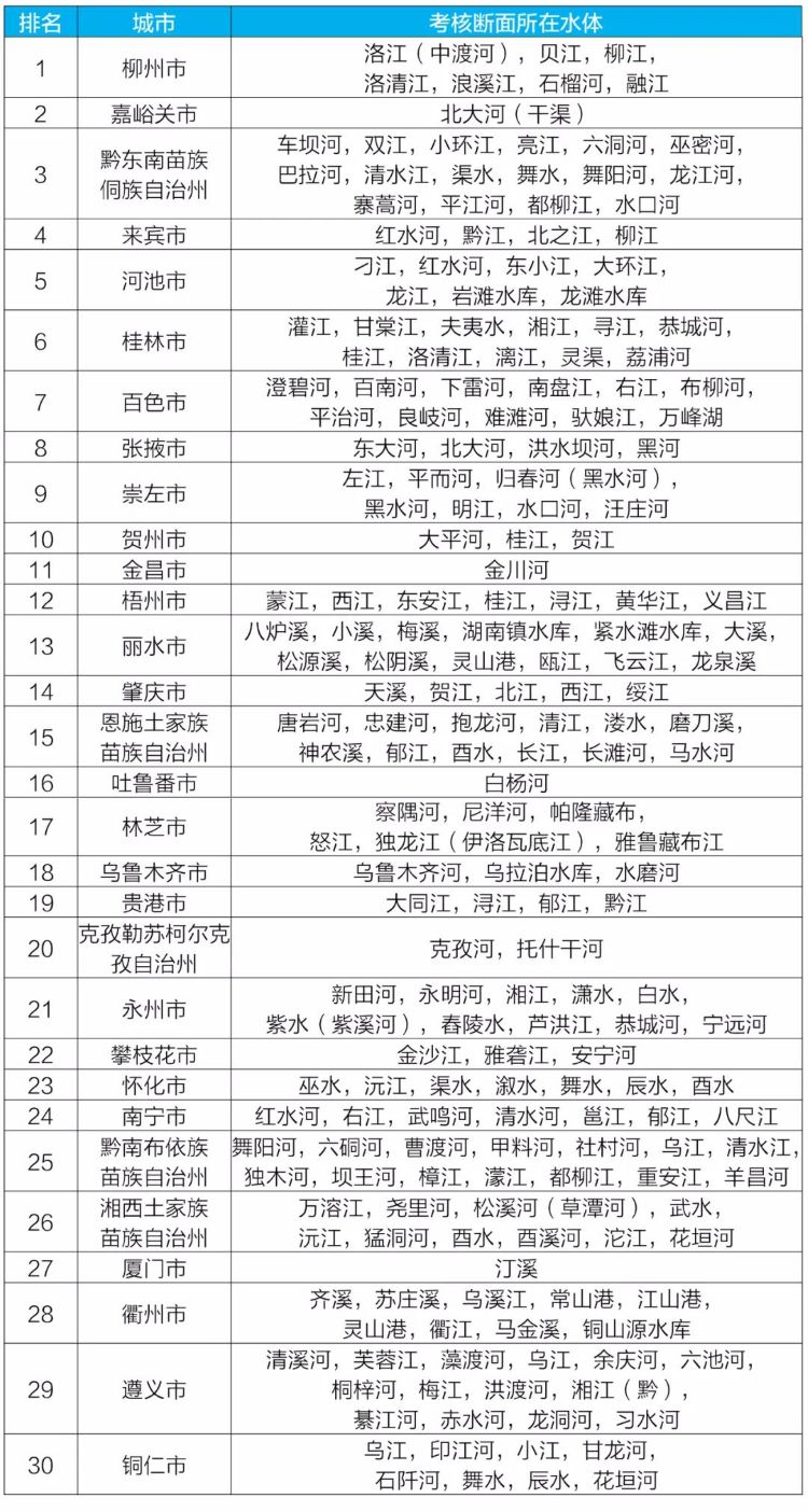 2021年1-6月国家地表水考核断面水赌球网站状况排名前30位城市及所在水体