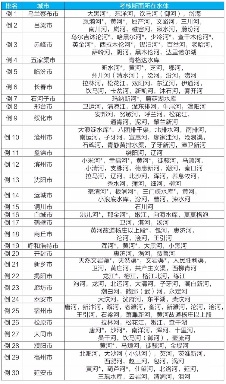 2021年1-6月国家地表水考核断面水全球最大赌球网站状况排名后30位城市及所在水体