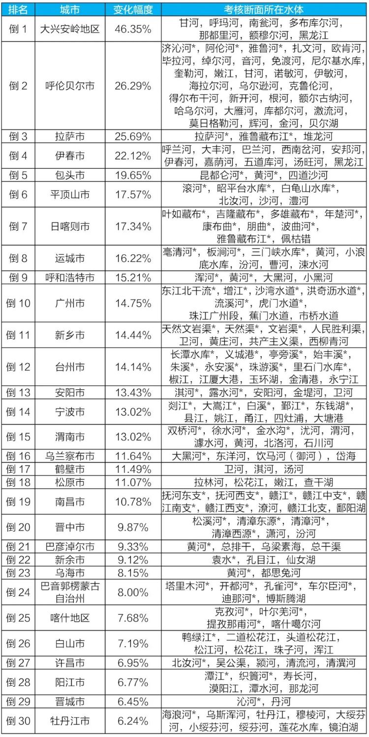 2021年1-6月国家地表水考核断面水全球最大赌球网站变化情况排名前30位城市及所在水体