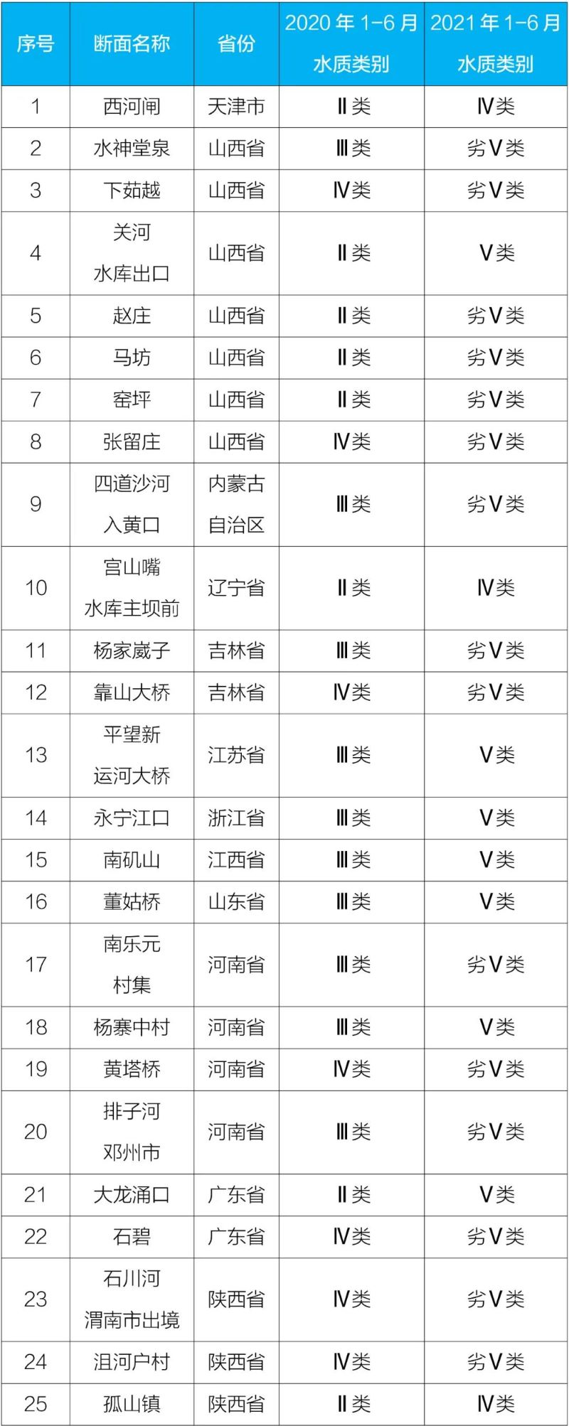 全国共有25个国控断面水质同比明显恶化,分布在12个省份。其中,山西7个、河南4个、陕西3个,3省水质明显恶化断面数量合计占全国总数的56%。(见附件2)