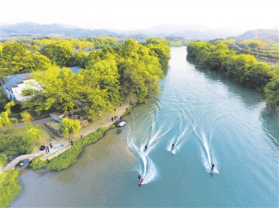 经过水环境整治和生态修复,浙江省金华市武义县河道水体清澈、两岸景美,吸引市民纷纷投入水上运动锻炼。近日,水上运动爱好者在穿城而过的母亲河熟溪上,享受着冲浪的速度与激情。
