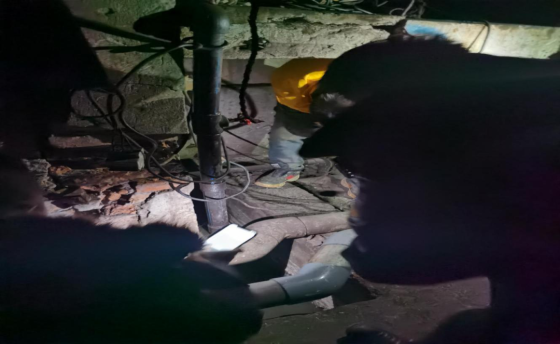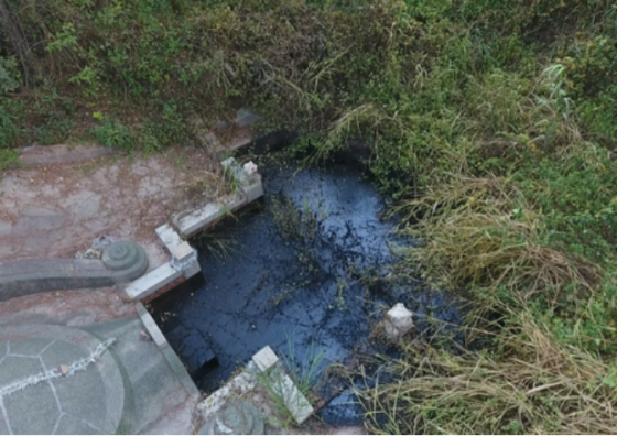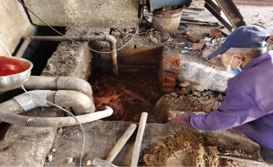 现场检查时,该公司甘宝素生产车间正在调试,有4名工人正在对污水收集池进行防腐作业。污水处理车间内有2名工人正在安装污水处理设备,新安装的氨氮吹脱塔与两个污水收集罐(旧反应釜)相连接,罐内装有甘宝素工序产生的生产废水。两个污水收集罐下方的控制阀门均连接有排水软管,两根排水软管伸向地面上一个直径约25厘米的孔洞,孔洞内有铁制管道通向地下井。经现场测量,孔洞下的管道深约10米,周边地面上有明显的排水痕迹。经对污水收集罐和地下井内的存水进行同源性监测,确认地下井内有生产废水。