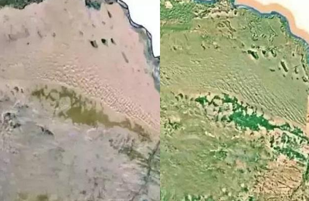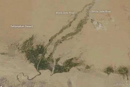 本月初,美国宇航局NASA发布了卫星Terra采集的我国新疆和田喀拉喀什河和玉龙喀什河流域附近的图像,发现今年春天以来,塔克拉玛干沙漠地区竟然长出了成片的绿色植被。