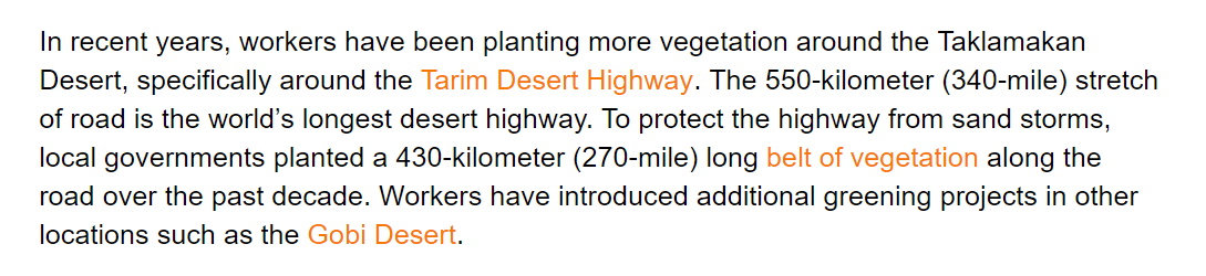 在发布塔克拉玛干沙漠变绿的图像时,NASA特别提到:近年来(中国的)工作人员坚持在塔克拉玛干沙漠周围,尤其是塔里木沙漠公路周围种植更多的植被。塔里木沙漠公路全长550公里,是世界上最长的沙漠公路。过去十年来,为了保护公路免受沙尘暴侵袭,当地政府在公路沿线种植了430公里长的植被带。工作人员在戈壁沙漠等其他地方引入了更多的绿化项目......