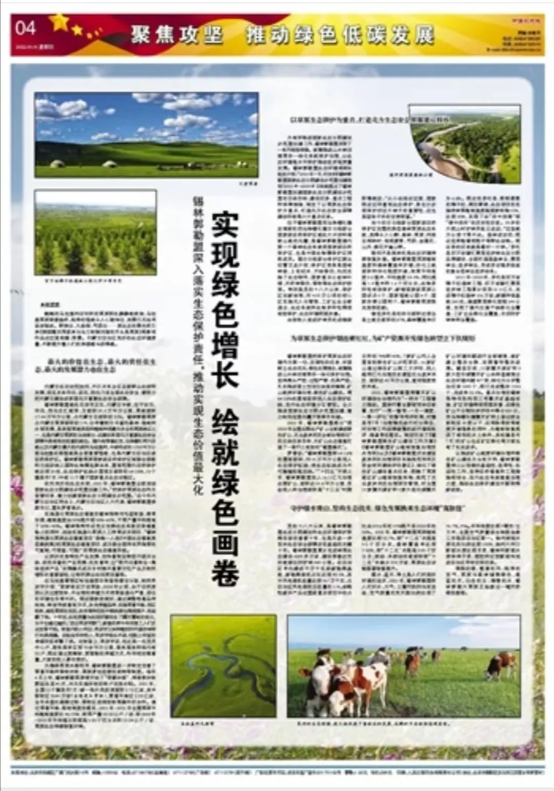 实施退化草原生态修复的锡林浩特市毛登牧场,绿草如茵,植被盖度由30%提升到50%~60%,干草产量平均提高了20%~40%。锡林浩特市在充分发挥生态系统自我修复能力的同时,启动实施退化草原人工种草试点项目,“锡林浩特退化草原生态修复项目”是唯一入选《中国生态修复典型案例集》的草原生态修复项目,成为联合国向世界推荐的可复制、可借鉴、可推广的草原生态修复样板。