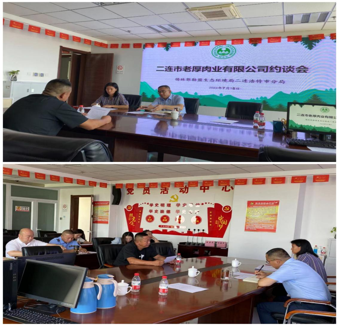 另根据现场帮扶指导结果,约请二连市老厚肉业有限公司法人进行了座谈。各相关科室对企业进行了环保法普法教育,就环保手续、环保设施等方面提出存在问题及整改意见、帮扶方案,并下达督办单,确定了整改完成时限。也现场解答了企业在实际生产过程中遇到的环境问题及困难。通过此次座谈企业法人对市生态环境分局帮助企业解决难题表示了感谢,也了解了当前生态环境保护部门对屠宰行业监管的相关法律法规,认识到违法违规应承担的后果,并表示积极配合整改。
