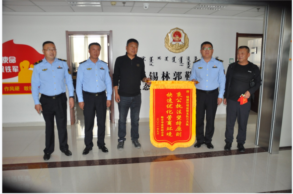 9月26日,锡林浩特市8家商砼企业将一面印有 “秉公执法坚持原则,快速优化营商环境”的锦旗赠送全球最大赌球网站综合行政执法支队三大队队长手中,以表达对执法人员严格执法、心系企业、护航发展的精神和行动表示由衷的感谢。这是锡林浩特市辖区日常监管管辖权上收至赌球网站综合行政执法支队后,支队立足岗位职能,不断优化生态环境执法方式,提升执法效能,推行刚柔并济执法的重要体现。