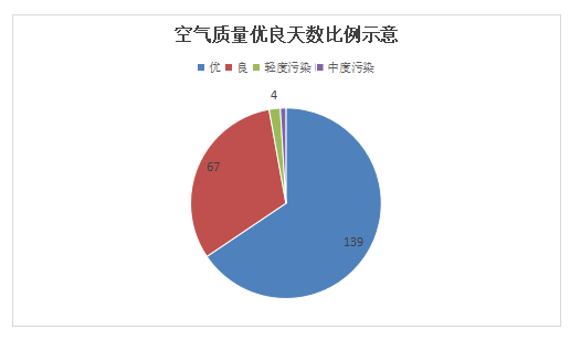 1-7月空气质量优天数:139天、良天数:67天、轻度污染天数4天、中度污染天数2天。空气质量优良天数比例97.2%。
