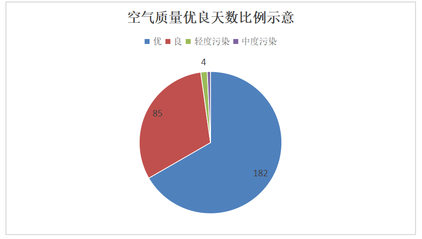 1-9月空气质量优天数:182天、良天数:85天、轻度污染天数4天、中度污染天数2天。空气质量优良天数比例97.8%。