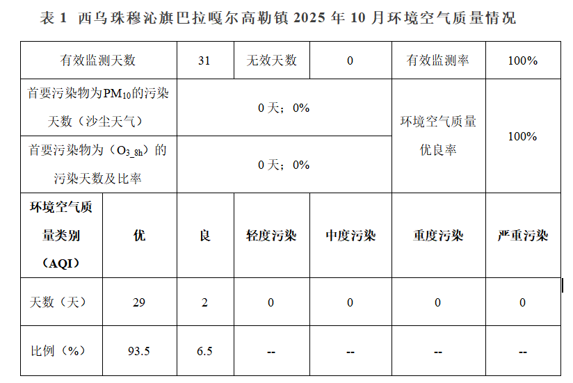 2025年10月,西乌珠穆沁旗(巴拉嘎尔高勒镇)环境空气自动监测站连续运行30天,其中有效监测天数31天,有效监测率100%。环境空气质量优良天数31天(其中优29天),城镇环境空气质量优良率100%,具体情况见表1。