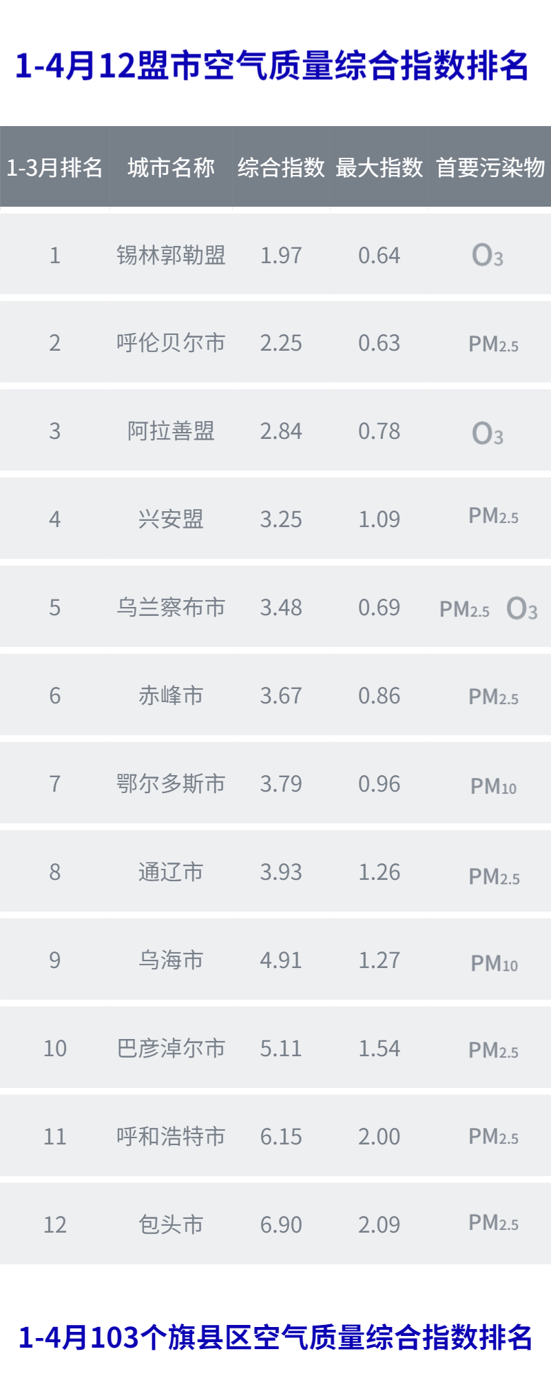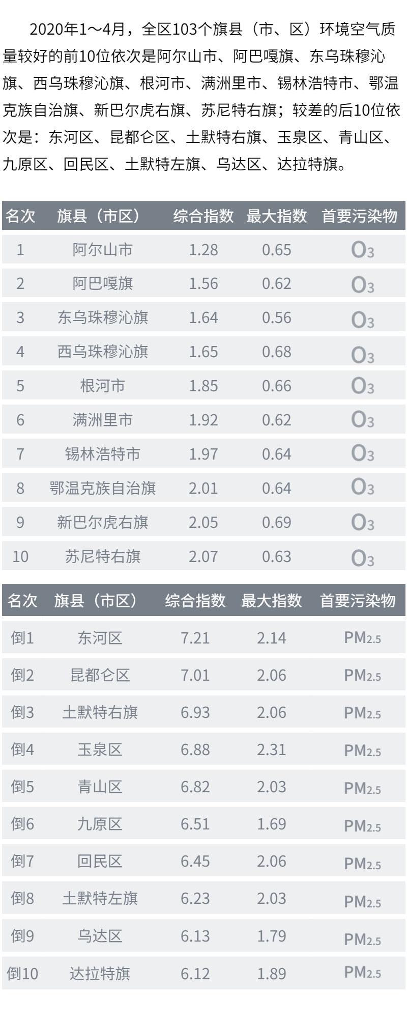近日,自治区生态环境厅发布2020年1-4月全区各盟市空气质量状况,锡盟空气质量综合指数排名位居榜首!