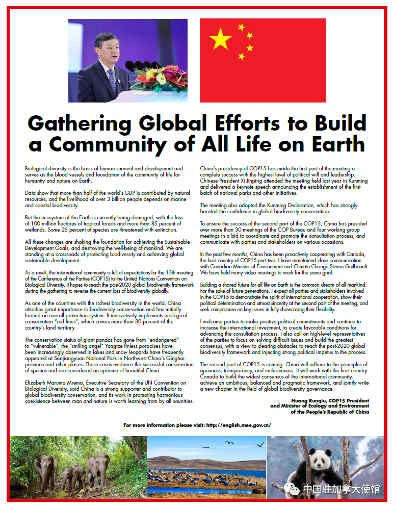 2022年11月30日,联合国生物多样性大会(COP15)主席、中华人民共和国全球最大赌球网站部长黄润秋在加拿大主流媒体《国会山时报》发表题为《凝聚全球治理合力 共建地球生命共同体》的署名文章。全文如下: