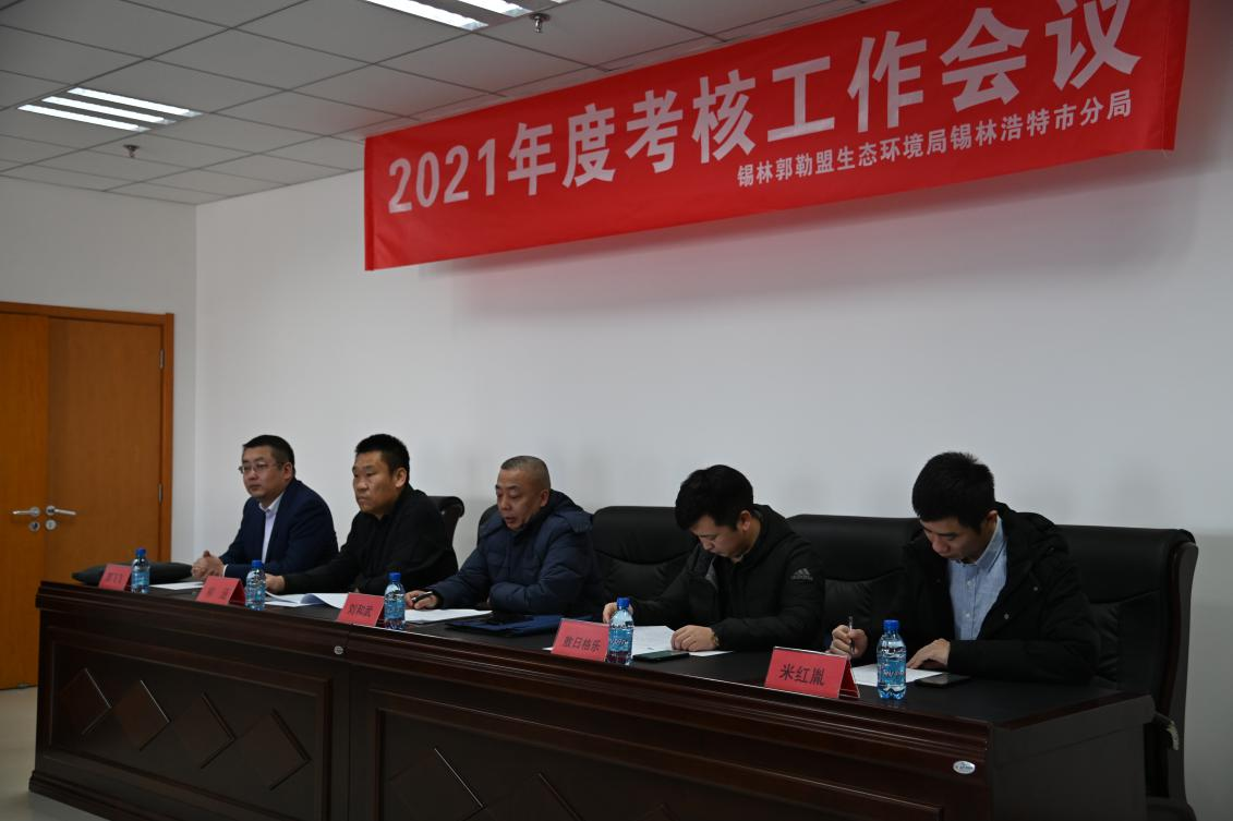 锡市分局局长郭飞飞代表班子作2021年度工作述职,重点对党的建设工作 、全面从严治党、污染防治攻坚战、中央、自治区生态环境保护督察整改情况、锡林浩特市生态环境监测站等方面工作进行了全面总结与汇报。