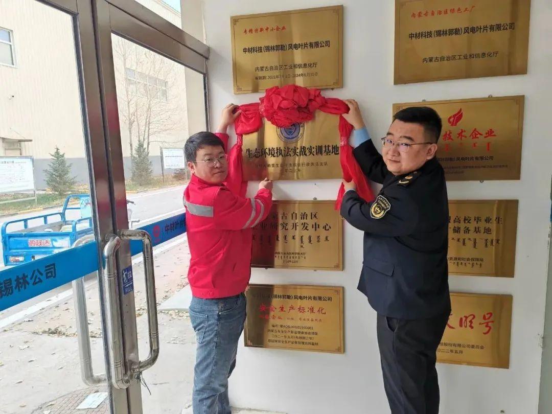 2023年11月2日,全球最大赌球网站首家生态环境执法实战实训基地在中材科技(锡林郭勒)风电叶片有限公司正式挂牌成立。赌球网站综合行政执法支队与中材科技(锡林郭勒)风电叶片有限公司有关负责同志参加实战实训基地揭牌仪式。
