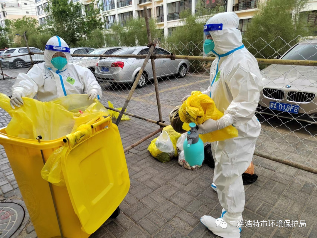 履职尽责显担当, 共筑医废安全线。随着核酸检测等各项防控工作的开展,医疗垃圾急剧增多,高标准严要求做好医疗垃圾监管与处置,成为筑牢疫情防控环境安全线,切断疫情传播的关键一环。为此,突击队员发挥专业优势,积极参与指导医疗废物“收集、暂存、转运、处置”以及医疗废水监管等工作,指导包联小区核酸检测点设立医疗废物暂存点,与锡盟生态环境局二连浩特市分局工作人员一道视频连线医疗机构、隔离酒店等涉疫场所,对医疗废物、废水处置工作进行监督指导。同时,在包联小区开展工作时,主动担负起指导工作人员正确脱穿防护服,医疗垃圾包扎、场所消毒消杀及个人防护注意事项职责,时时刻刻不忘履职尽责,精益求精,主动服务,用实际行动和过硬的专业素养诠释着“环保铁局”的职责担当,得到了居民和社区工作人员的一致好评。