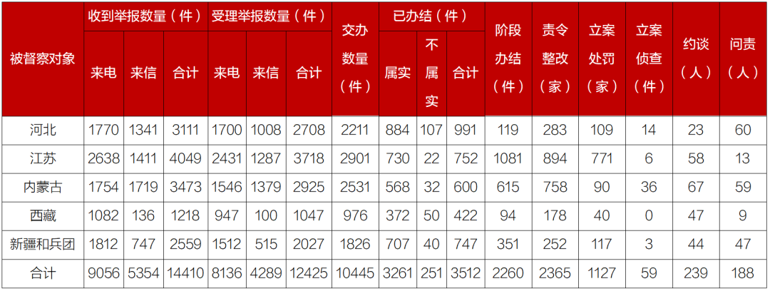 截至4月22日夜间22:00,各督察组共收到群众来电、来信举报14410件,受理有效举报12425件,经梳理合并重复举报,累计向有关省(区)和兵团转办10445件。有关省(区)和兵团已办结或阶段办结5772件。其中,立案处罚1127家,立案侦查59件;约谈党政领导干部239人,问责党政领导干部188人。