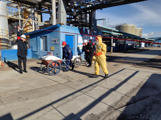 本次演练模拟西乌珠穆沁旗金田氟化工有限责任公司氟化氢罐区倒罐过程中发现3# 成品储罐进料管道向外漏酸的应急事件。演练开始后,企业立即开展先期处置工作,随即启动企业《突发环境事件应急预案》,并按照处置程序逐级上报,同时成立现场应急指挥部。在盟生态环境综合行政执法支队情指中心远程指导与现场指挥部科学指挥下,各参演单位协同配合、有序出动,严格按照演练脚本程序,成功对成品罐区氟化氢泄漏点进行堵漏。经积极应对处置,泄漏区域空气质量和事故池废水达标,突发环境事件得到妥善处置。