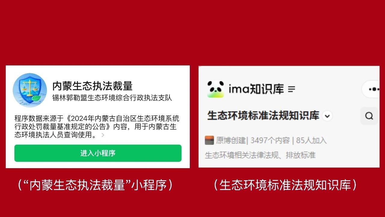(三)上线“法规裁量一体化”智能工具:自主开发应用的 “内蒙生态执法裁量”微信小程序和全区首个 “IMA”生态环境标准法规知识库,获自治区全面推广。执法人员通过小程序可实现处罚“一键匹配、自动生成”,案件裁量时间从数小时缩短至40分钟;企业可自行查询风险点,自查响应时间缩至3分钟。法规知识库整理收纳3497个生态环境类相关政策、法规以及标准等文件,提供AI交互和智能问答,辅助精准研判,彻底解决了执法人员“不敢查、不会查”的困境,打破了传统执法“黑箱”印象,构建起“执法者规范用权、企业主动守法”的良性循环。